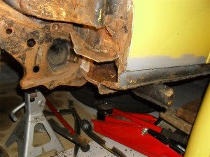 Hallo fans,1 kant zit de torsie vering er weer in/op en ik heb hem ongeveer 3cm hoger gedaan dan zoals hij zat. Ik heb hem wel op z'n wiel gezet maar kon nog niet echt zien hoeveel hij gezakt is.  Het voor en achter spatbord zijn er af en de wiel kasten zijn weer netjes geteerd met tectiel. De spatborden zelf ook weer mooi zwart van binnen en bij het voor spatbord 3 bout gaten gerepareerd[gelast]. Een paar plekken geplamuurd en nu nog strak maken Dit komt niet zo nouw want het word toch schilder werk Als het lukt deze week 1kant schilderen.PS de kleur stelling word anders ,hij word zijdeglans zwart onder de sierlijst en geel daar boven En dan naar de anderen kant wie weet wat daar te voorschijn komt